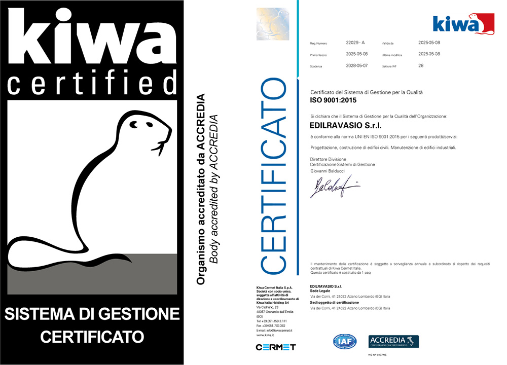 A tal proposito nell’anno 2025 l’International Organization for Standardization (ISO) ha rilasciato a Edilravasio Srl la Certificazione ISO9001 che dimostra la conformità della nostra società a specifiche norme internazionali, nonché l’impegno verso qualità, efficienza e miglioramento continuo.